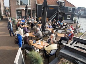 De anderen nemen nog een drankje bij het restaurant naast de molen.
